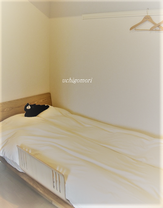 このベッドガード、新しい寝室にも馴染んでいい感じに見えてまーす。