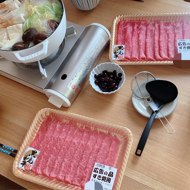 ・しゃぶしゃぶ用牛肉②・焼き肉用牛肉・ローストビーフ用ブロック・ちくわ②牛乳・白菜・ブロッコリー・豆腐・ミニトマト・生椎茸・玉子・人参・コロッケ・冷凍うどん・半紙