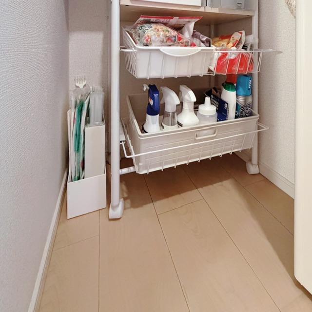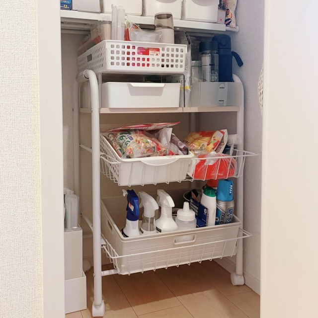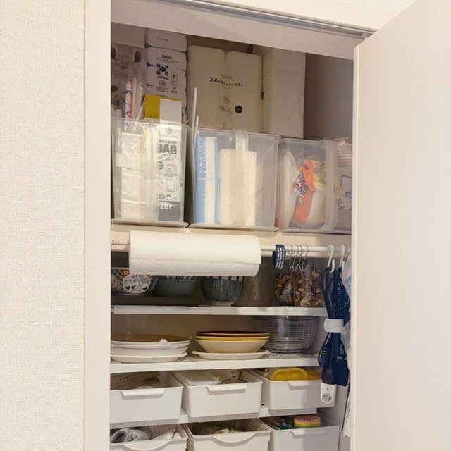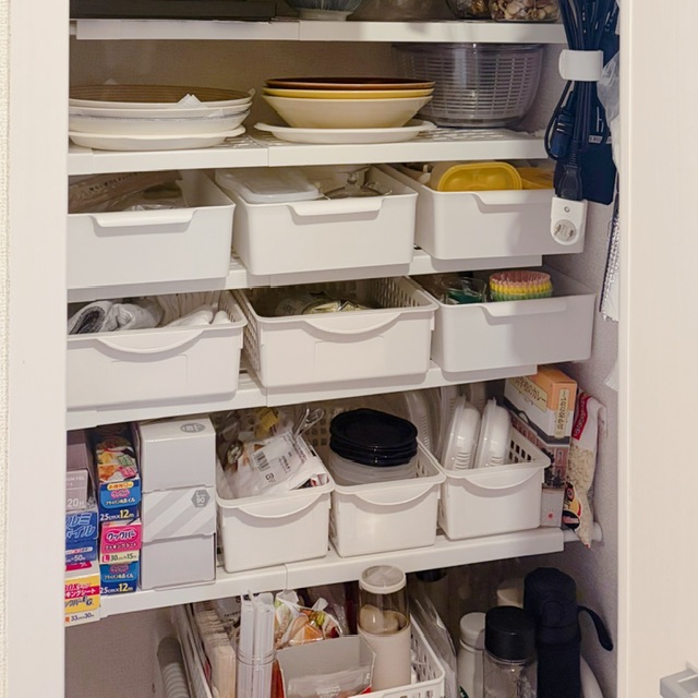 真っ白な同じものがずらりと並んだ収納。中身が全く見えない凄い収納を皆さん披露なさってますが、我が家はそれには程遠い😞
