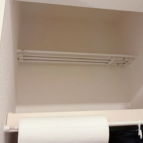 (枕棚のみ、キッチンタオル他ティッシュ等紙消耗品在庫を後方に。トイレットペーパーは入っていません)
