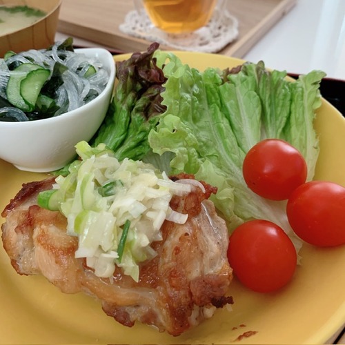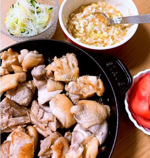 夜はね、昨日モーさん食べなかったから…。鶏もも解凍しててですね。ダメになるので。私は昨日と全く同じメニューですが💦