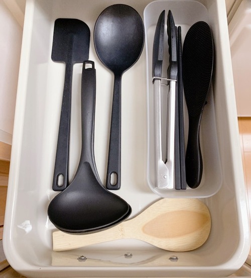 竹のお箸を菜箸にしてるので調理の度にここを開けるし、計量スプンもあるし、卵かき混ぜ棒のトクも入れてます。横にはスクレイパーとスケッパーも