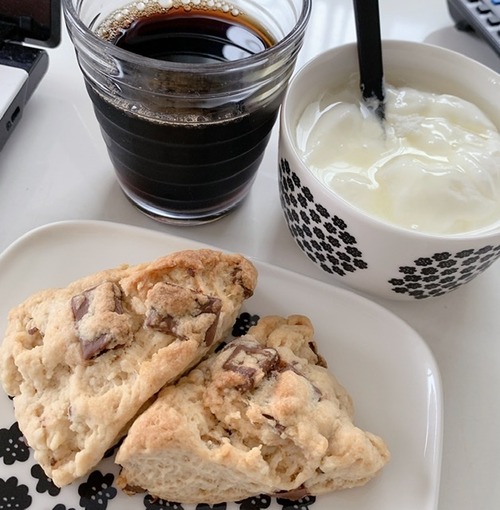 ホットケーキ焼く?とか、時間かかるけど、スコーン焼くとか相談し、結局、冷凍庫の「パルム」で我慢。そんな経緯で、朝からスコーンを焼いています。