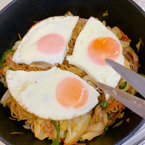 結局、小松菜やめてもやしもやめて、都合により(残っていた物から先に)キャベツを使い人参ピーマン入れました。