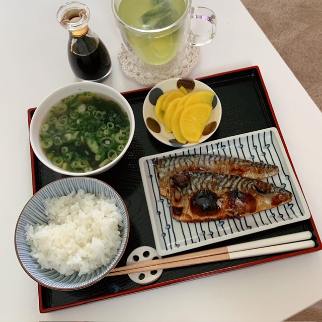 副菜ゼロで塩さばランチ。大根を娘が貰って来てくれてるのですが大根下ろす元気なーーーし(無し)で。