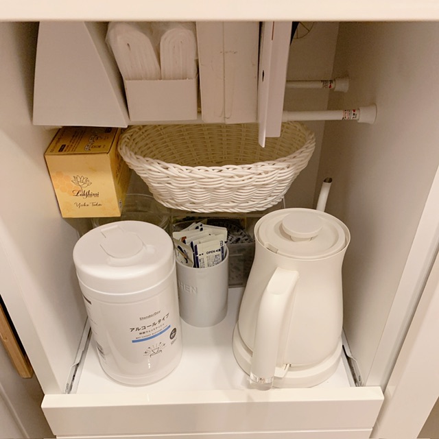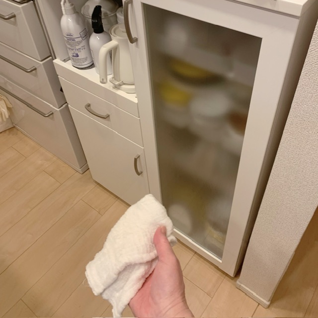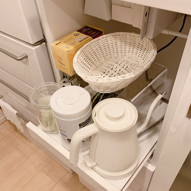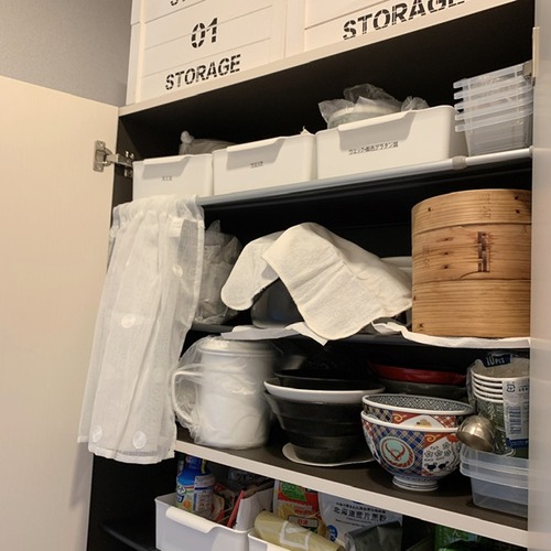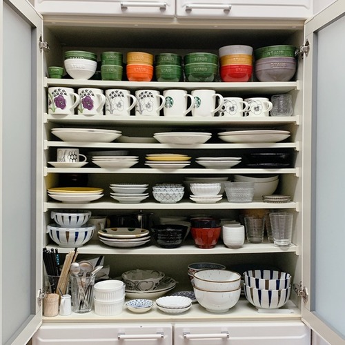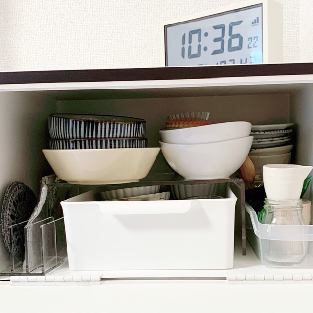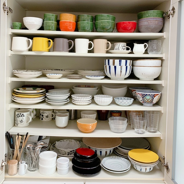 ここ下段には娘のおべんとクロスや布巾なども入れていたのでそれを撤去。後は処分か悩んでいる類の器たちを左に寄せてスペースを開けました