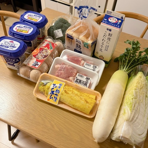 ・ラ王②・どん兵衛(カップ麺)②・ヨーグルト②①・牛乳・食パン・卵・鶏モモ②・沢庵・大根・白菜・ブロッコリー
